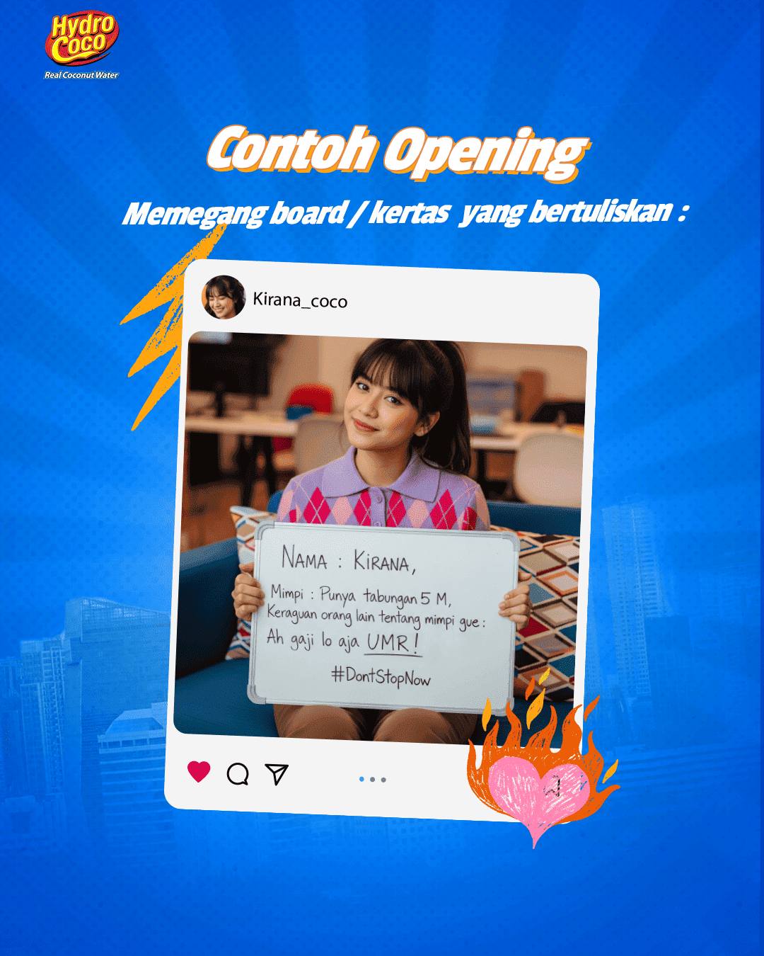Opening video wajib menggunakan board / kertas bertuliskan nama, mimpi & keraguan orang lain tentang mimpi yang mau lo capai. Tuliskan juga #DontStopNow (Contoh ada di bawah)